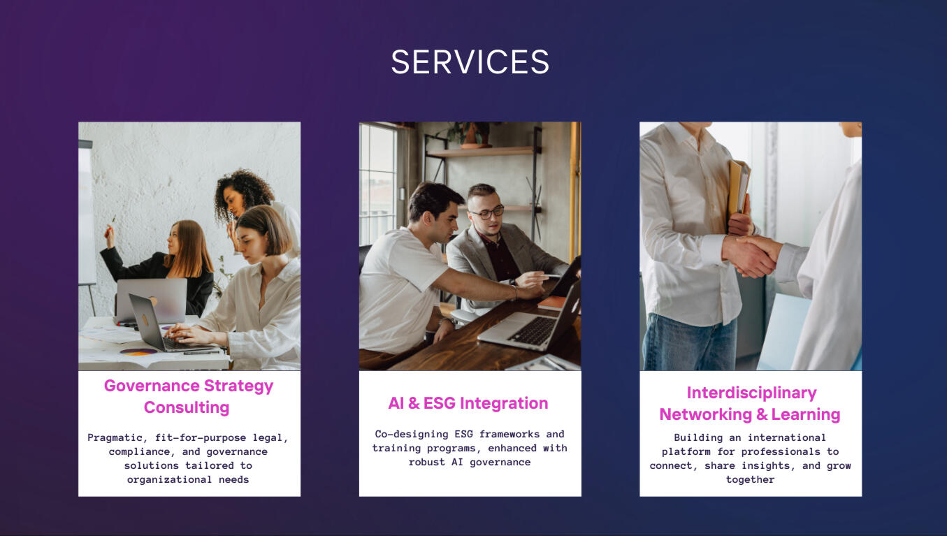 在跨國企業中協助建立風險控管與合規架構,並推動落地實踐擅長結合 AI 治理與 ESG 永續策略,打造具未來感的治理方案長期推動 跨領域專業交流平台,連結國際專業人士共享知識與洞見
